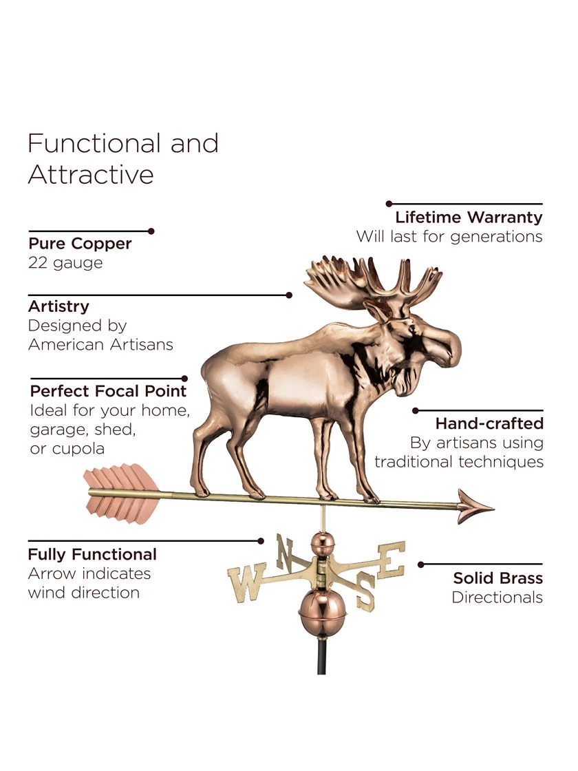 The quest of Thoreau’s Indian guides, the moose is the largest member of the deer family. Now he’s ready to adorn the rooftop of your home, garage, cupola, barn or gazebo. For over 35 years Good Directions pure copper weathervanes have been unsurpassed in style, quality, and durability – perfect for the house-proud homeowner. Weathervanes are easy-to-assemble and install. Includes an assembly rod, solid brass 18″L directionals, and copper globes. A 401AL Roof Mount is recommended to mount your weathervane to your rooftop, sold separately. The assembled size of this weathervane is 37”L x 40″H x 18″W. The figure-only size is 37″L x 22″H x 3″W. The Pure Copper will age naturally over time. Our exclusive Single Point Contact? design allows our weathervanes to spin easily in the wind. Bring The Joy of Outdoor Living? to your home with this heirloom-quality piece.