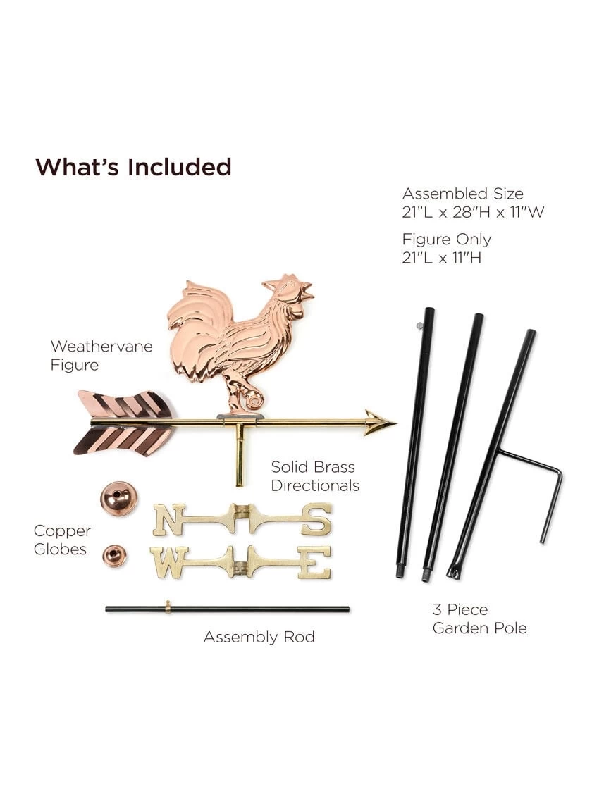 With chest and tail feathers proudly puffed out, this rooster is ready to adorn your garden, deck, or yard. For over 35 years Good Directions Pure Copper Weathervanes have been unsurpassed in style, quality, and durability – perfect for the house-proud homeowner. Bring the Joy of Outdoor Living℠ to your home with this heirloom-quality piece. The pure copper will age naturally over time.